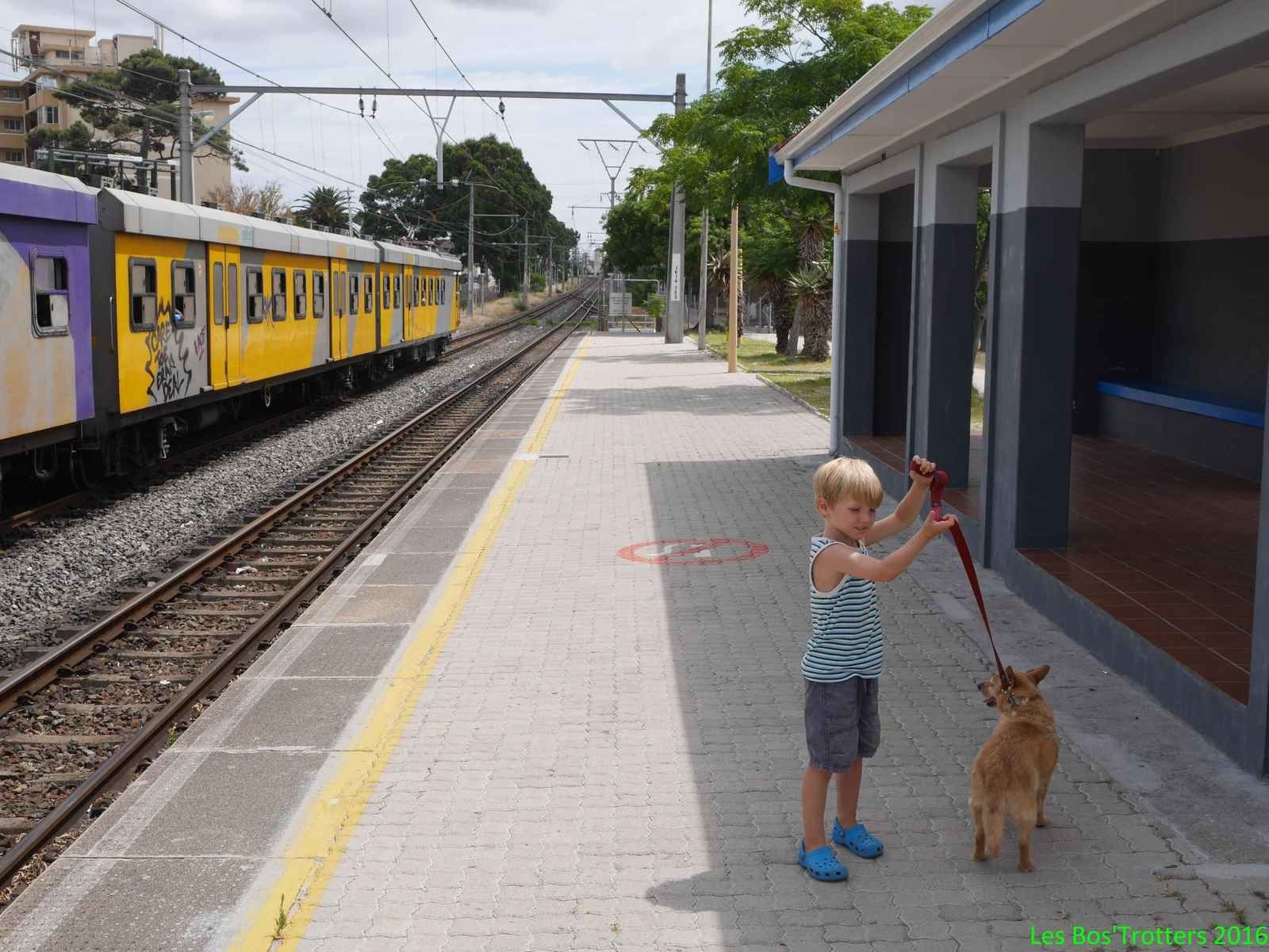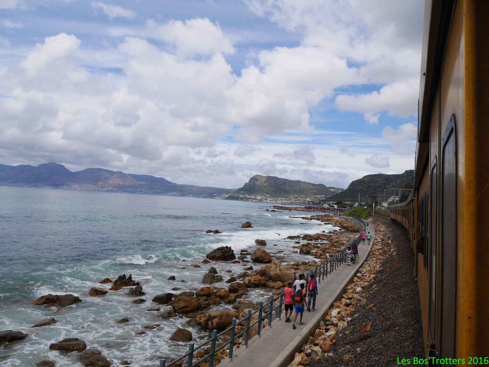 Sur les conseils de Nadine, nous prenons le train depuis Capetown en direction de la cote Est de la péninsule. Celui-ci est fréquenté par les travailleurs. Un train de banlieu en somme. Sauf qu'au contraire de nos trains crasseux, de nos gares dégoutantes et de nos tunnels aux relents d'urine, ici tout est propre. Pas design et high-tech, non, on voit bien que les lieux et le train ne sont pas récents mais c'est propre, ce n'est pas vandalisé et en plus on s'y sent en sécurité.