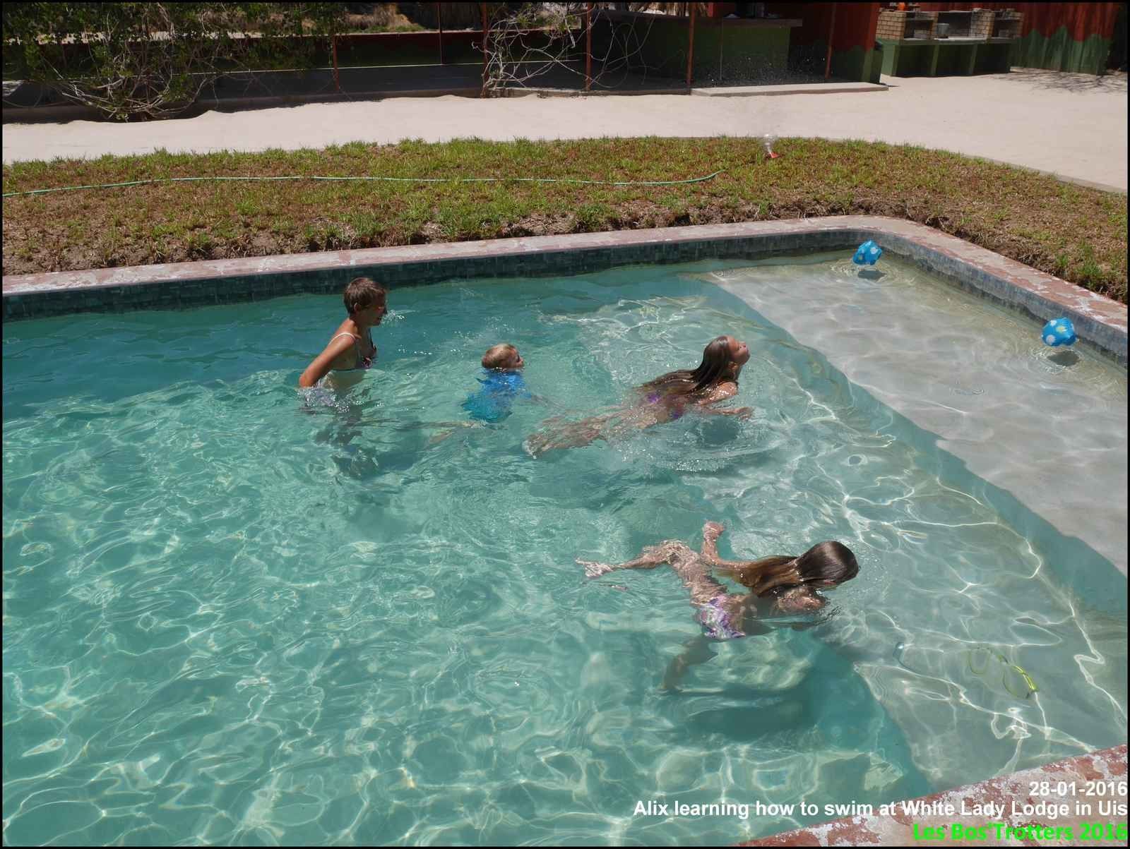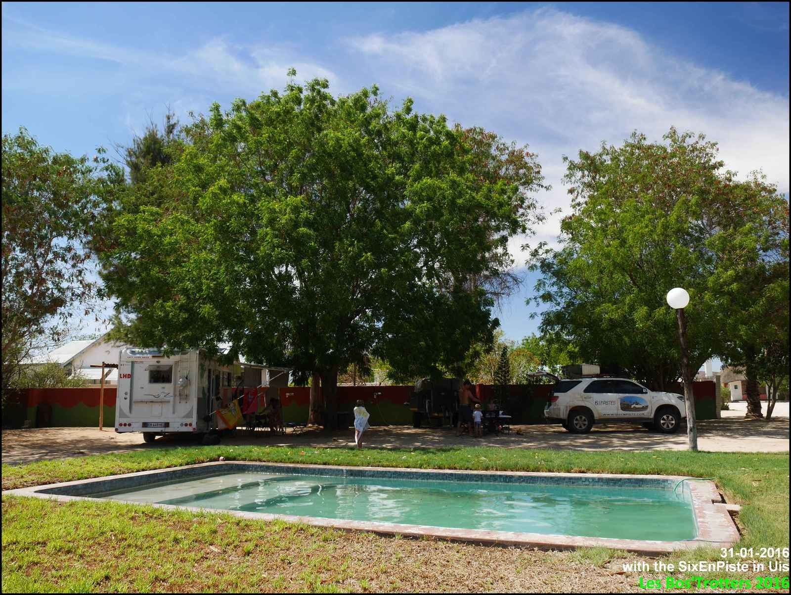Une longue et vibrante piste plus tard, nous arrivons dans une ville minière isolée dans ce désert. On se croirait dans un western. La ville est silencieuse et paraît sans vie. Il nous faut vraiment de l'eau, tous ces bivouacs sauvages sont fantastiques mais épuisent les réserves et nous décidons de nous offrir un bivouac dans le "camping" que nous dénichons. Les enfants sont heureux car contre toute attente, une superbe piscine (propre) les attend! Nous pouvons apprécier la fraîcheur d'une bonne bière et d'une douche dont l'eau est pompée dans une nappe phréatique affleurante faisant du lieu un oasis apaisant.
