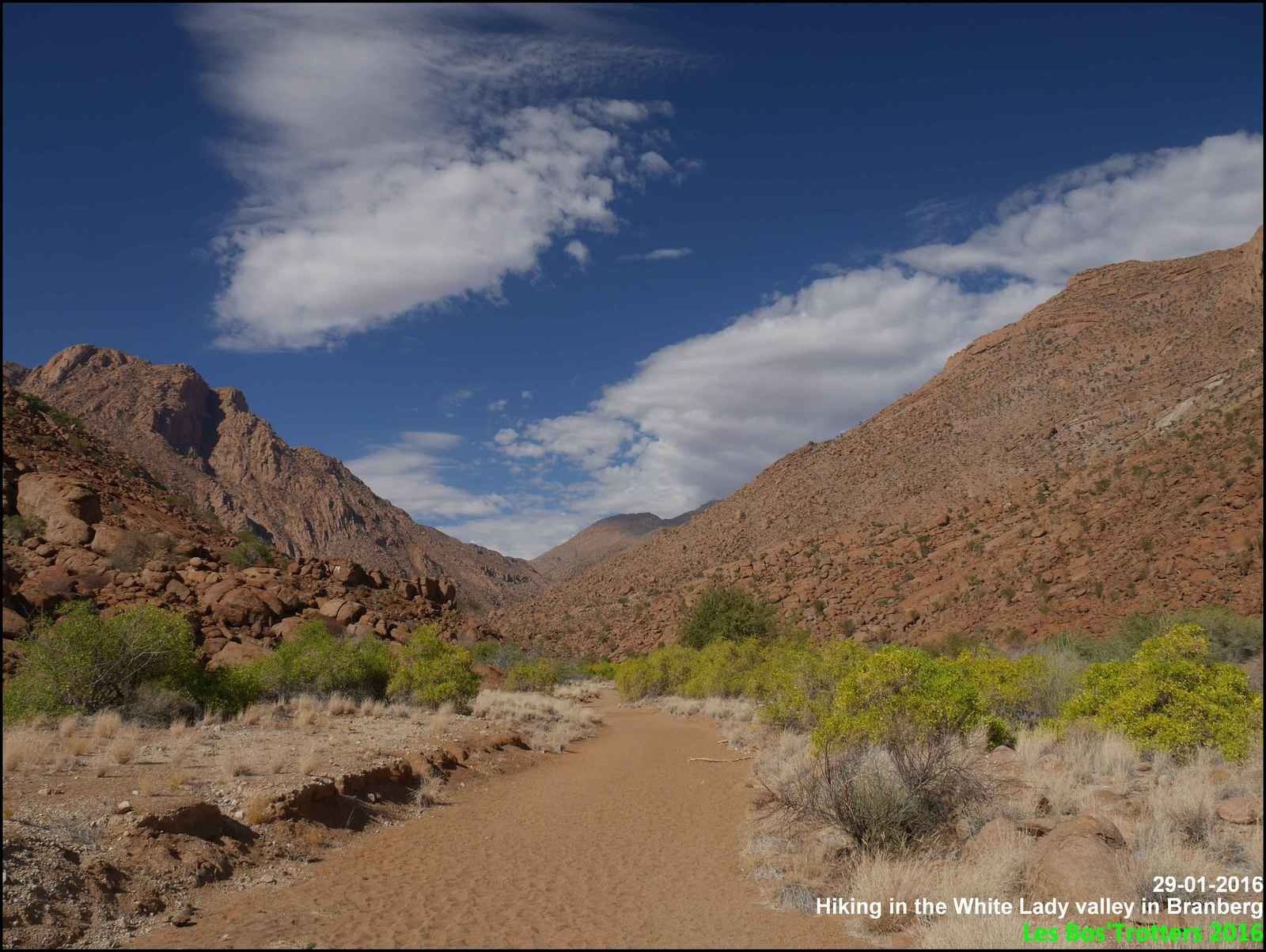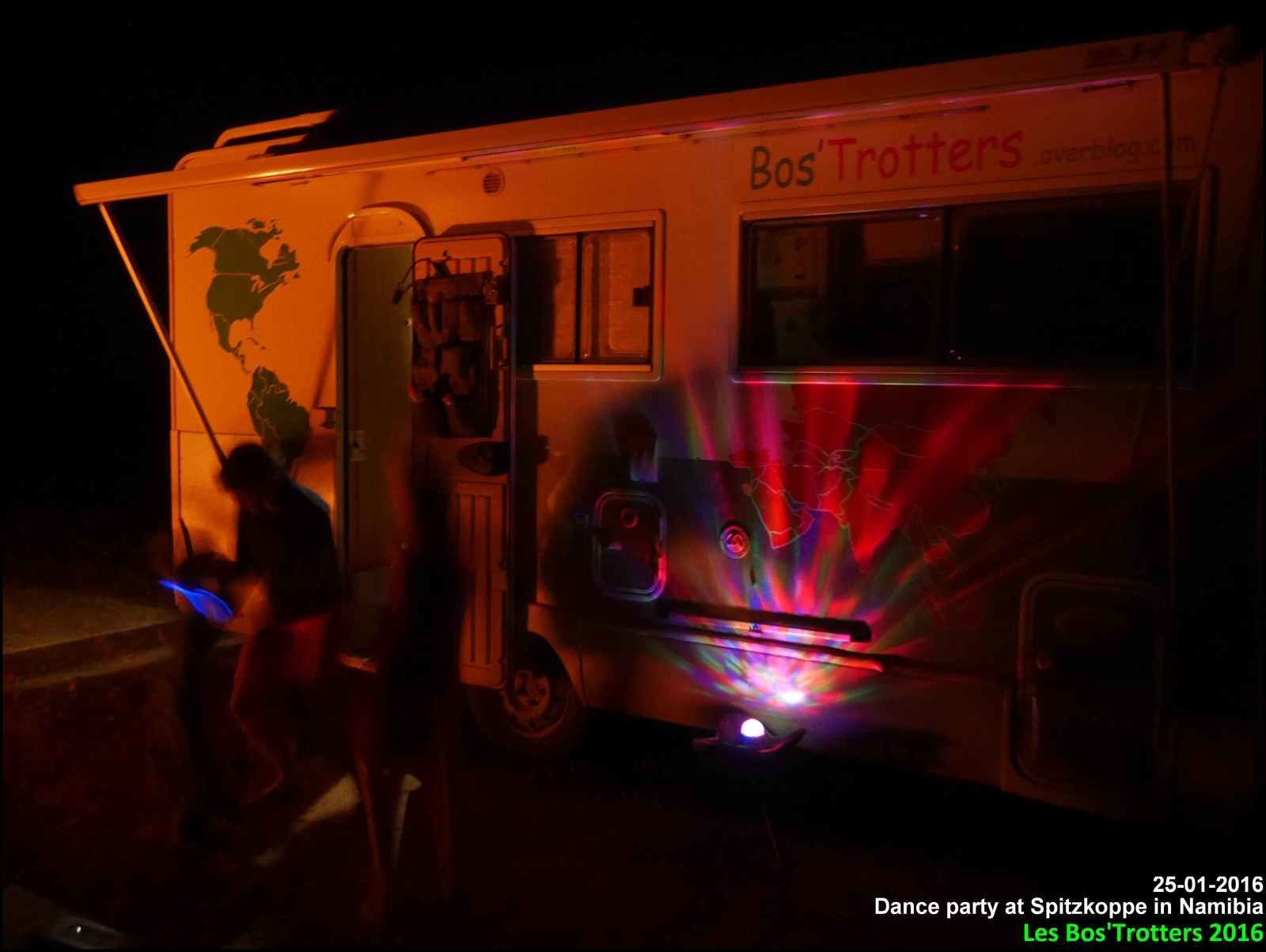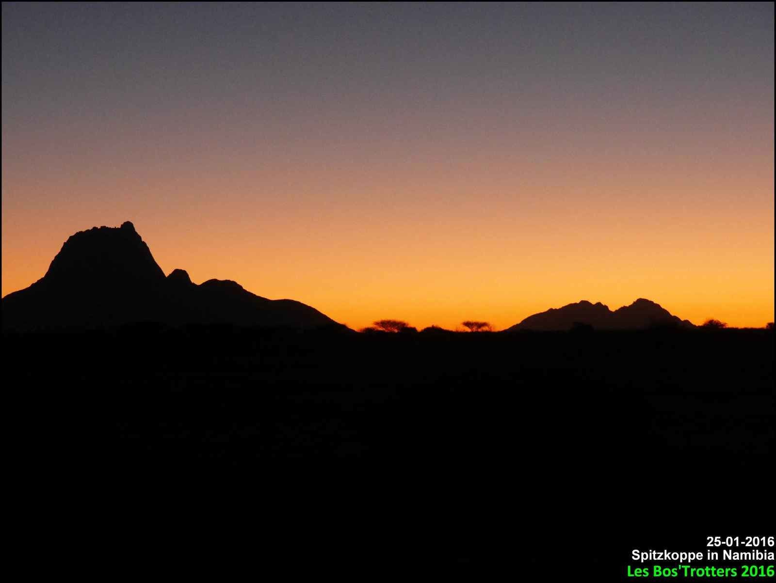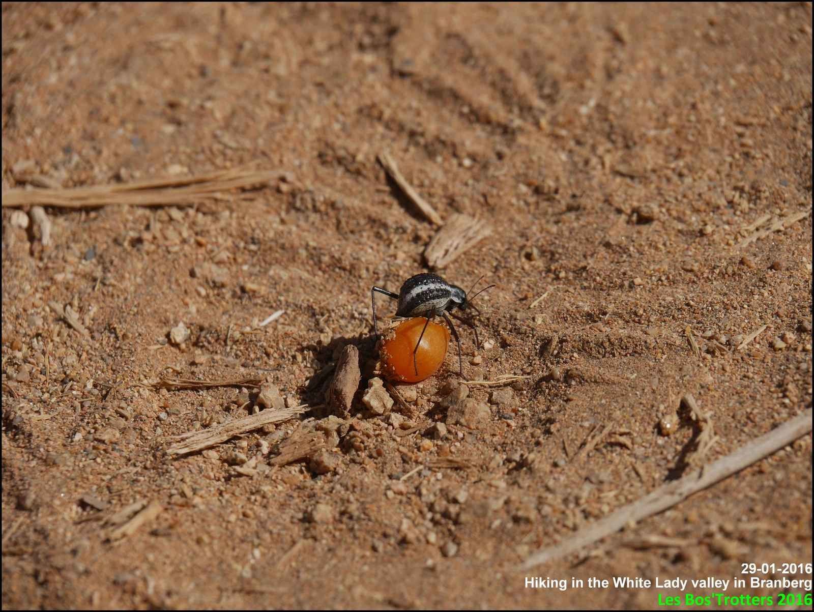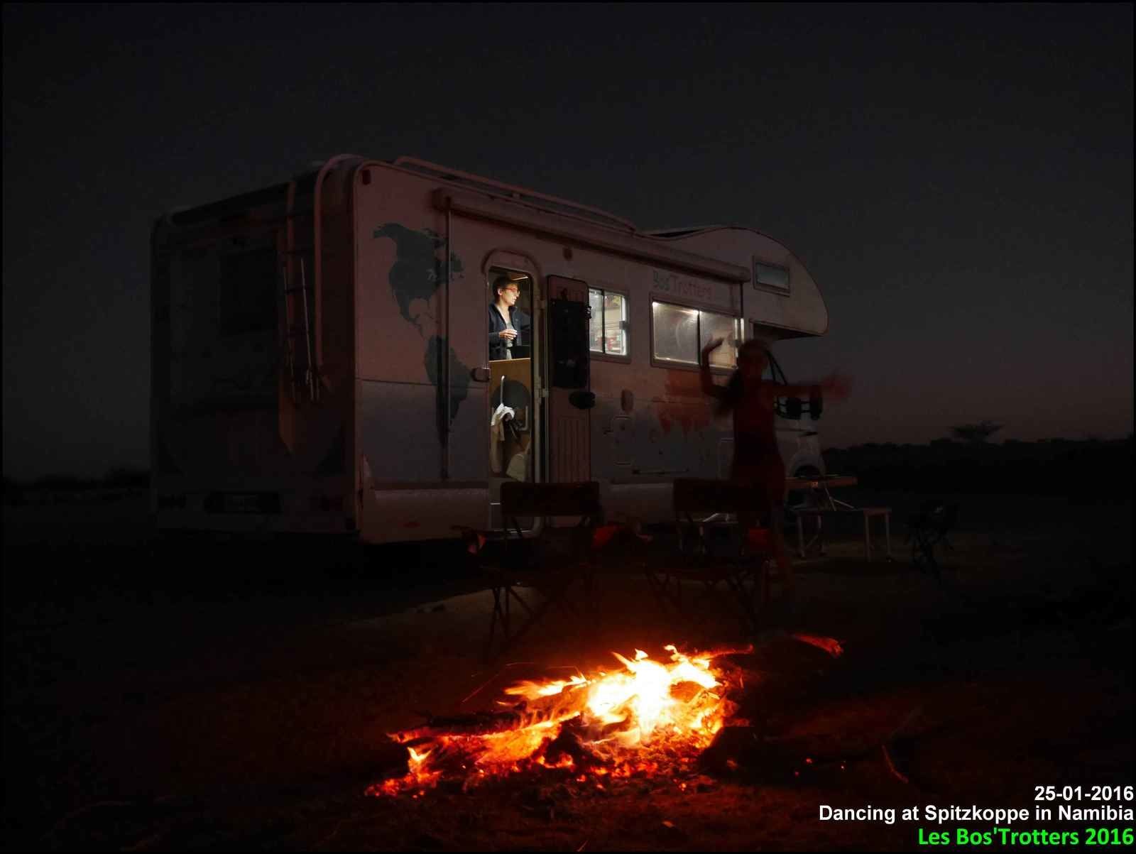 Non loin de la ville d'Uis se trouve, en plein désert, une montagne culminant à plus de 2000m. La "montagne de feu" doit son nom à la couleur rougeâtre qu'elle arbore le soir au coucher du soleil. Elle est aussi connue pour abriter une peinture rupestre dont l'interprétation a connue de nombreuses variantes. Connue sous le nom de "White lady", il s'agirait en réalité du dessin d'un homme dansant. Nous profitons de l'absence, en cette période, des nerveux éléphants du désert pour bivouaquer dans le lit d'une rivière proche du site que nous irons visiter le lendemain. A la tombée de la nuit, nous tenterons bien de faire bruler quelques crottes d'éléphant pour éloigner les nuées de mouches mais nous finirons par nous réfugier à l'intérieur du camping-car. Décidément les insectes nous en veulent en Namibie! Les lasagnes à la Potjekos (prononcer Poy-ki) finiront de cuire seules sur le feu!