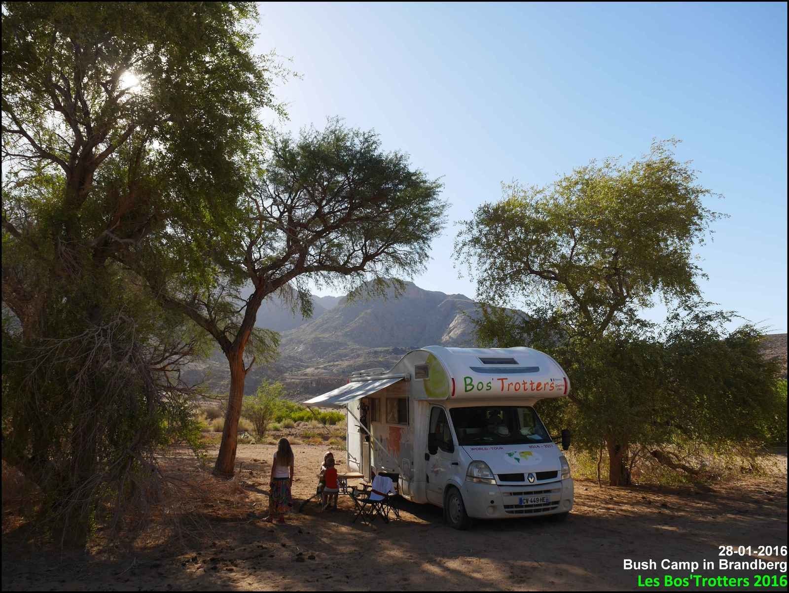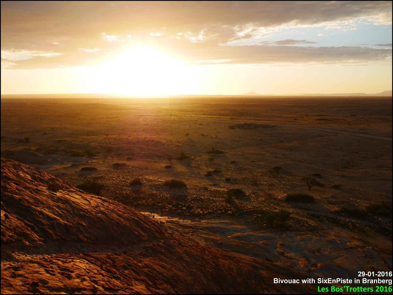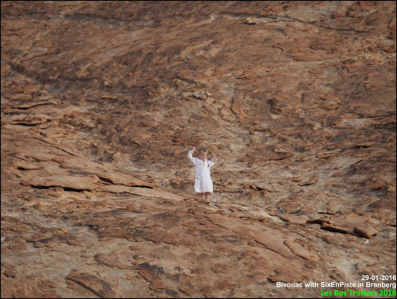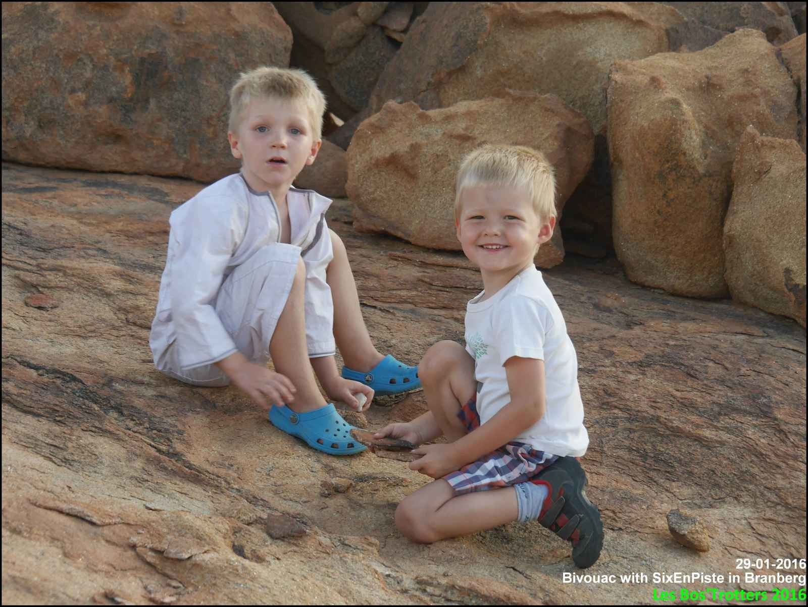 Alors que nous sommes plutôt à la fin de notre périple africain, une autre famille française démarre tout juste son voyage. Autre famille, autre mode de transport, ils ont opté pour un 4x4 avec une remorque tente dont seuls les Sudaf ont le secret! Nous nous donnons rendez-vous d'abord dans le camping à la piscine à Uis avant d'aller bivouaquer dans le désert au pied d'une "bulle" de granit qui nous offre une vue splendide sur le Brandberg.