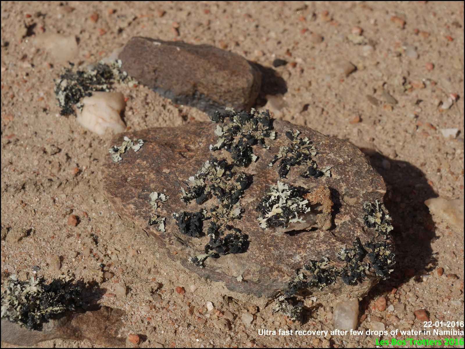 Un Lychen qui semble déséché mais qui revit en quelques secondes à la première goutte d'eau symbolise la capacité de la nature à s'adapter dans l'un des déserts les plus arides au monde. Nous nous amusons à en arroser quelques fragments pour la leçon de sciences des enfants!